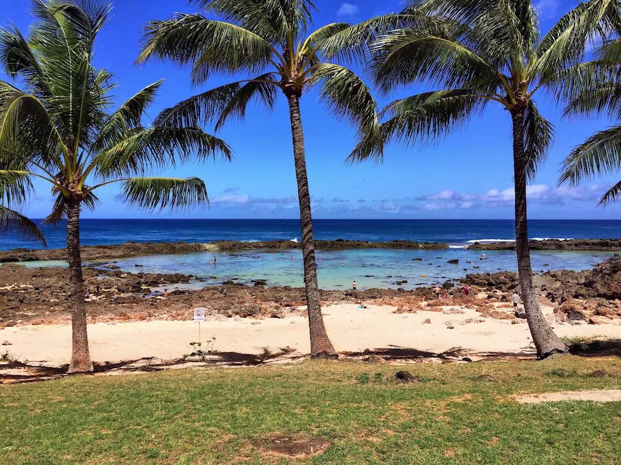 The pool is great for kids as the rock wall protects from the north shore waves, although during surf season or high winds getting too close to the edge can be dangerous as waves do crash over the wall. If you visit, stay closer to the beach, especially with small kids, and enjoy the crystal clear waters and tropical fish swimming around your feet.