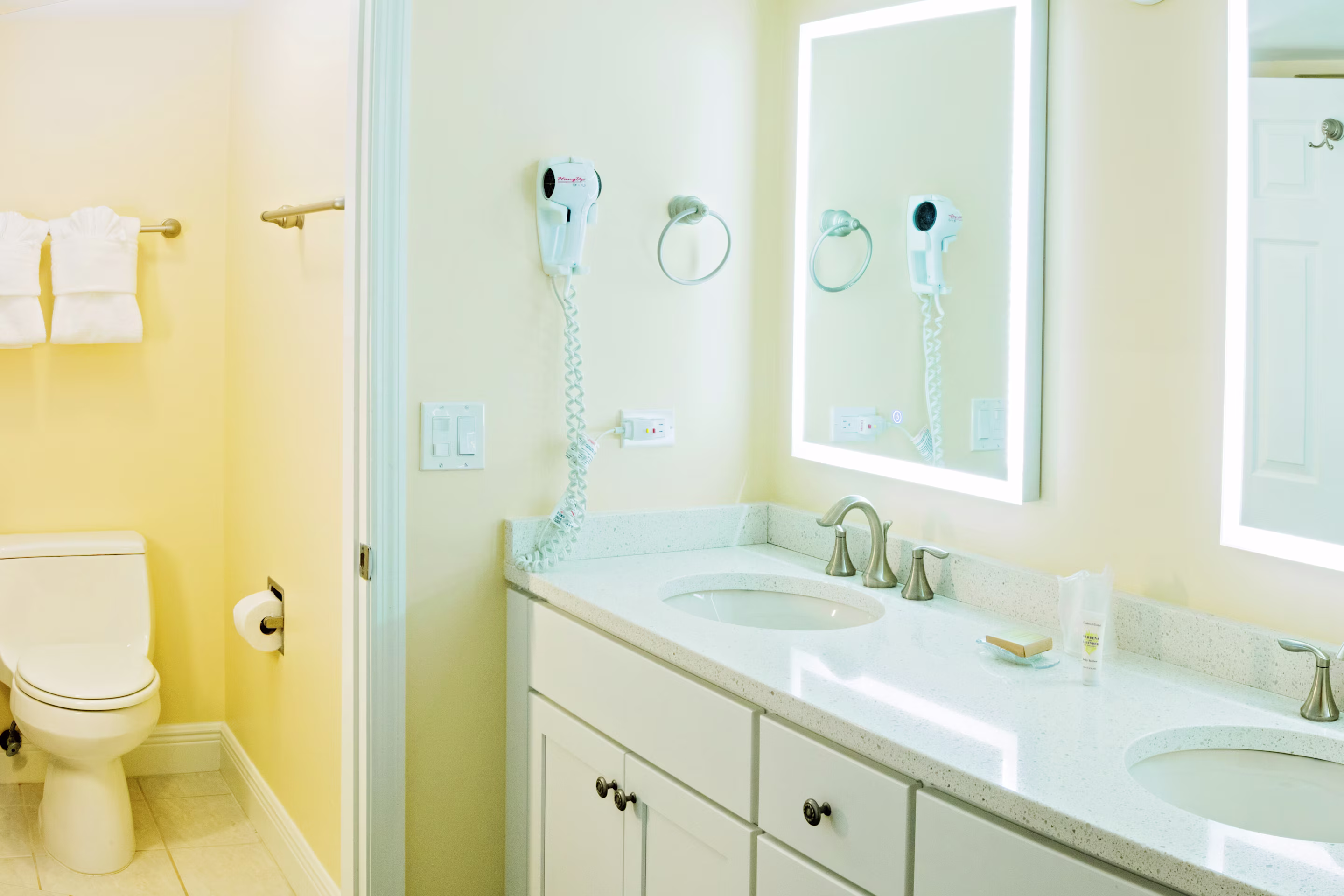 Spacious 2-Bedroom Suites feature a primary bedroom with a king-size bed and a bathroom with a freestanding shower. The second bathroom comes furnished with two twin-size beds and includes a separate bathroom with a standard tub. The Suite also offers a spacious living room with a queen-size sleeper sofa and a fully equipped kitchen with a microwave and a coffee maker.