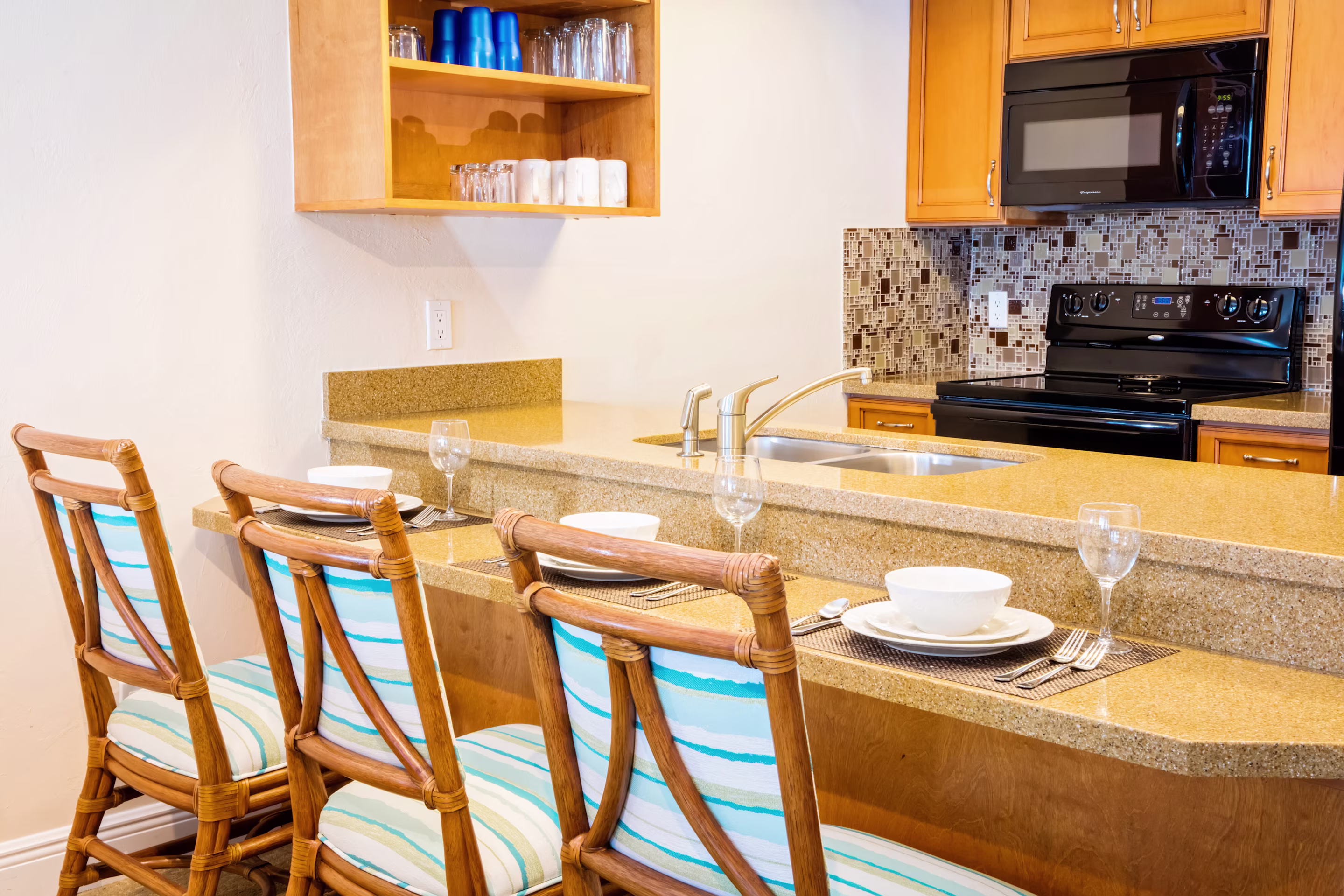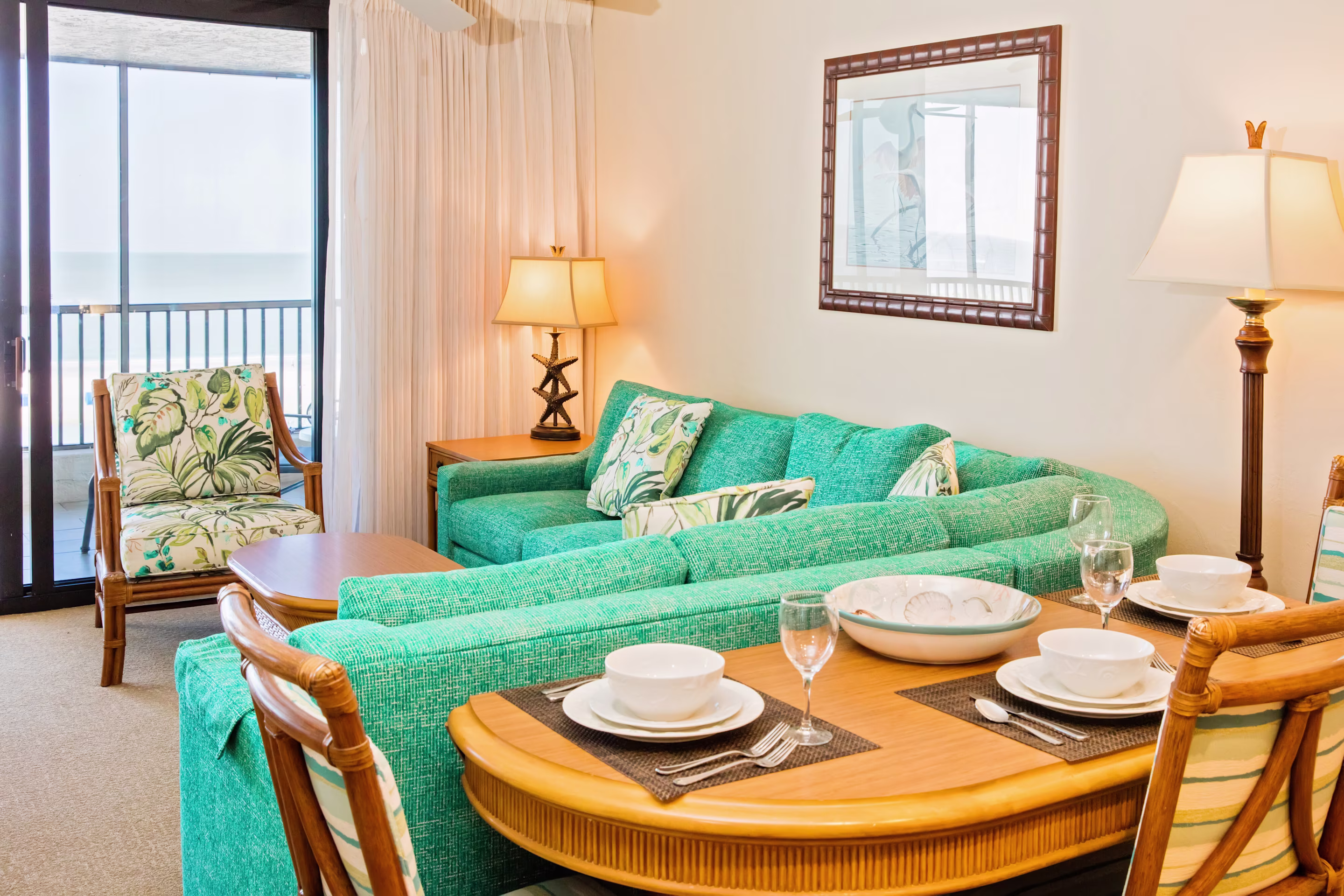Enjoy spacious 1-Bedroom Suites with full kitchens, dining areas and screened-in balconies.
