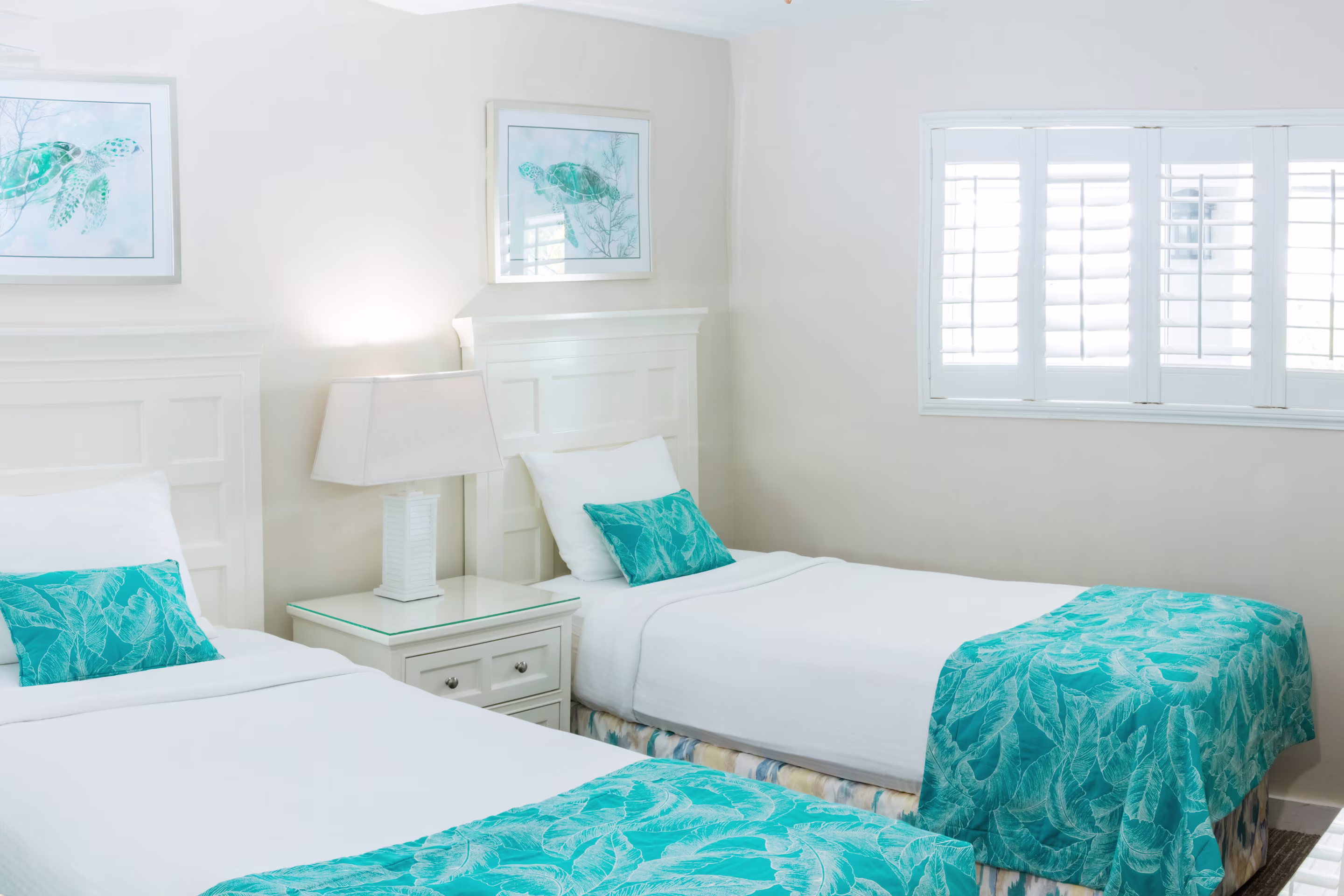 Spacious 2-Bedroom Suites feature a primary bedroom with a king-size bed and a bathroom with a walk-in shower. The second bedroom is furnished with two twin-sized beds and includes a separate bathroom with a standard tub/shower combination. Suites also offer a spacious living room with a queen-size sleeper sofa and a separate dining area as well as a fully equipped kitchen with a microwave and a coffee maker.