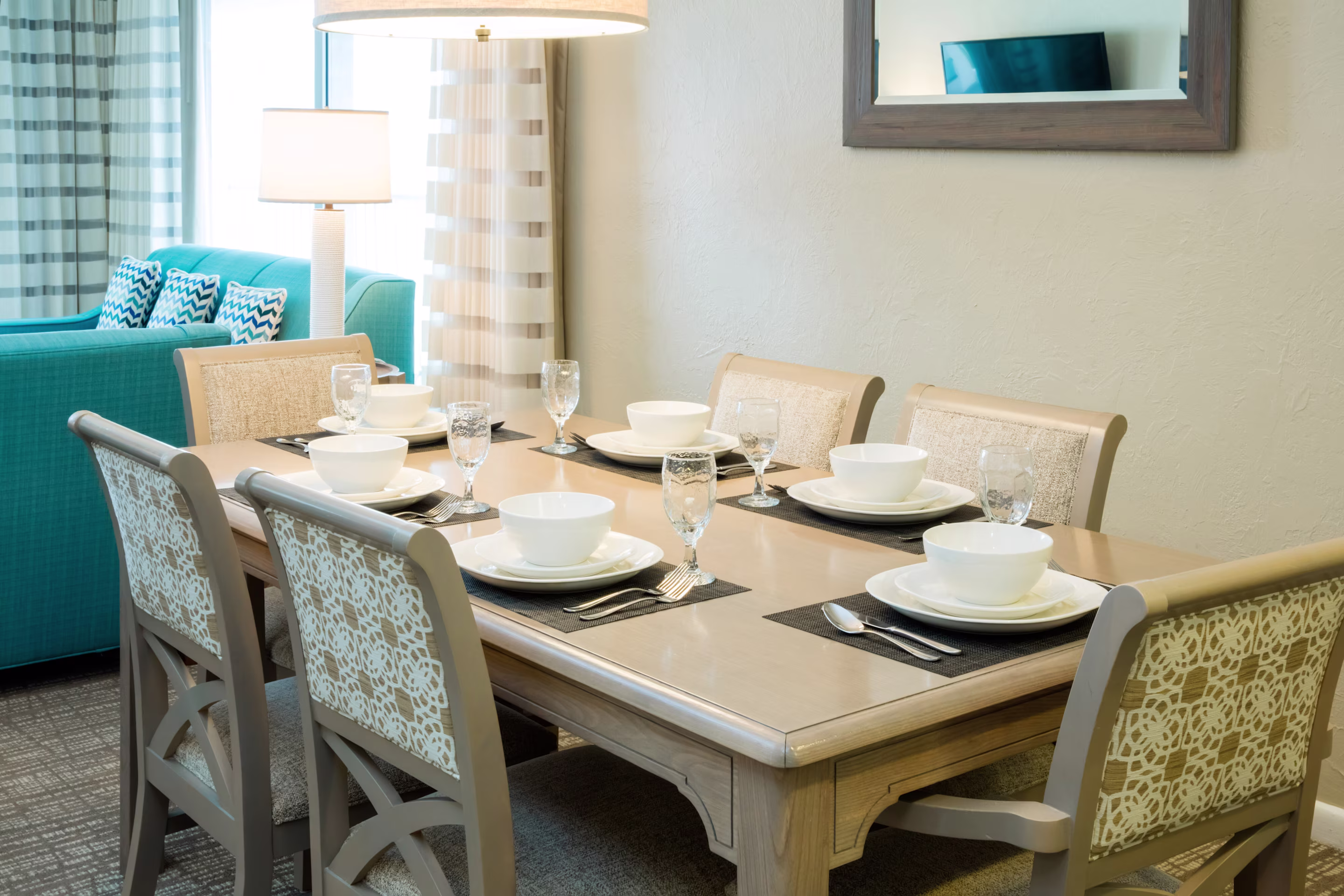 The 2-Bedroom/2-Bathroom Suite includes a patio or balcony, a primary bedroom with king-size bed and a bathroom with a walk-in shower. The second bedroom is furnished with two twin-size beds. The Suite also includes a generous living room with separate dining area, queen-size sleeper sofa, and fully equipped kitchen with a refrigerator, stove, dishwasher, microwave, coffee maker and toaster.