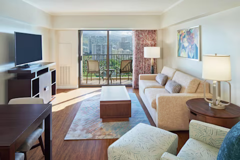 1-Bedroom Suites feature a lanai with either full or partial ocean views. The bedroom features either a king-size bed or two double beds and a bathroom with a glass-enclosed shower. Suites also include a spacious living room with a queen-size sleeper sofa, separate dining area and a fully equipped kitchen complete with a stove, oven, refrigerator, dishwasher, microwave, coffee maker, electric kettle and rice cooker