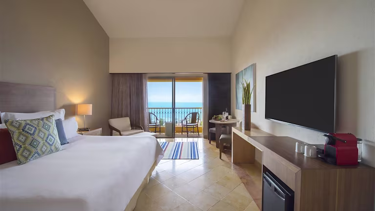 Studios feature a balcony or patio with ocean, pool or desert garden views, a king-size bed or two double beds, a bathroom with a standard shower/tub combination, and a mini-fridge, microwave, coffee maker, dishware and utensils.