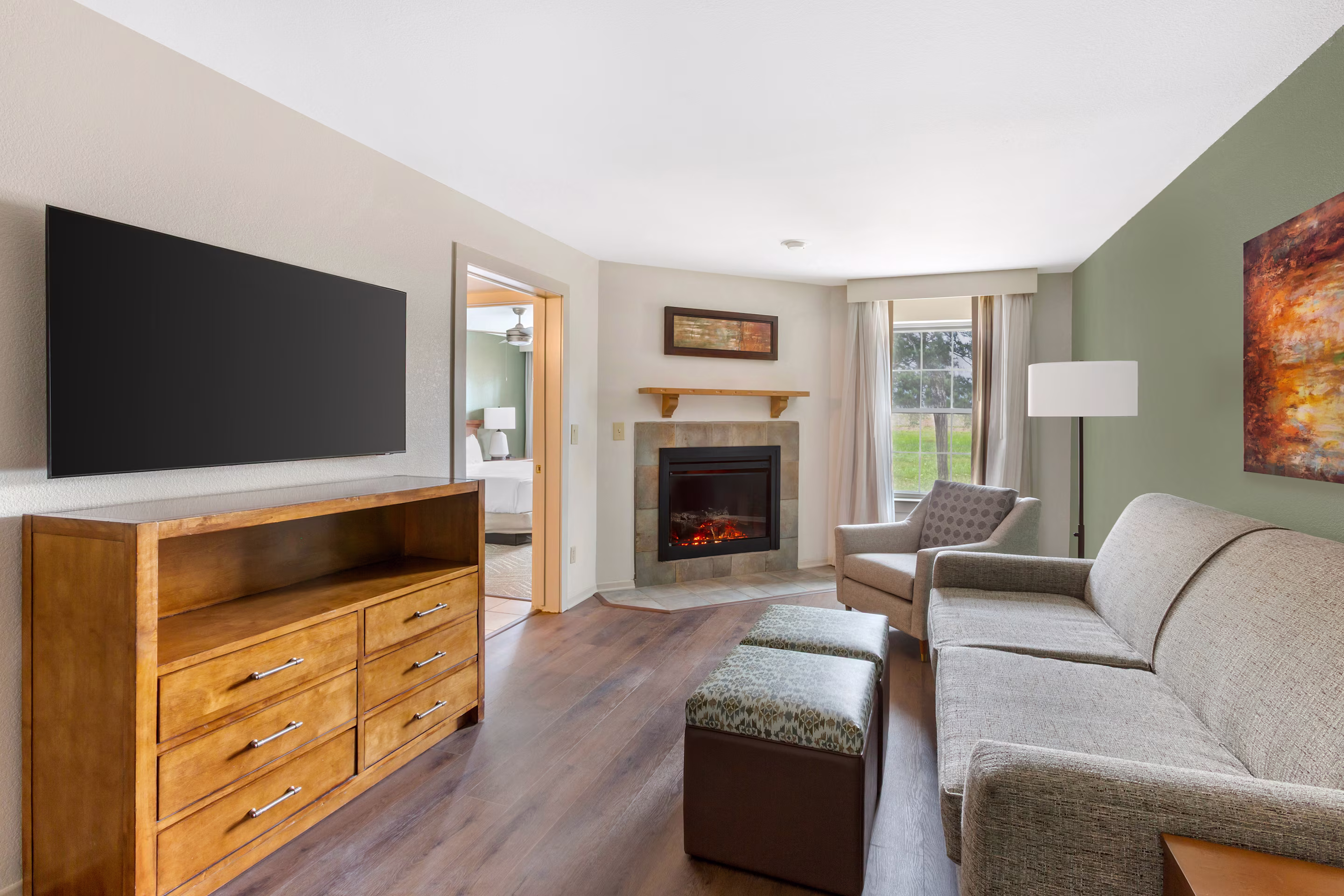 1-Bedroom Suites feature a king-size bed, a sleeper sofa in the living area and a partial kitchen with a refrigerator, coffee maker, microwave, dishwasher and two-burner stovetop. 1-Bedroom Deluxe Suites also have a fireplace and some have a balcony or patio.