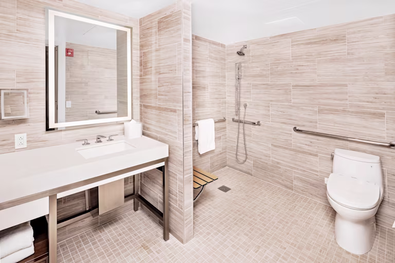 Spacious Studios feature a king-size bed and a bathroom with a walk-in shower as well as a 65-inch TV, mini-fridge, coffee maker and faux-wood flooring. Select Studios also feature lounge seating and cabinets with glassware.