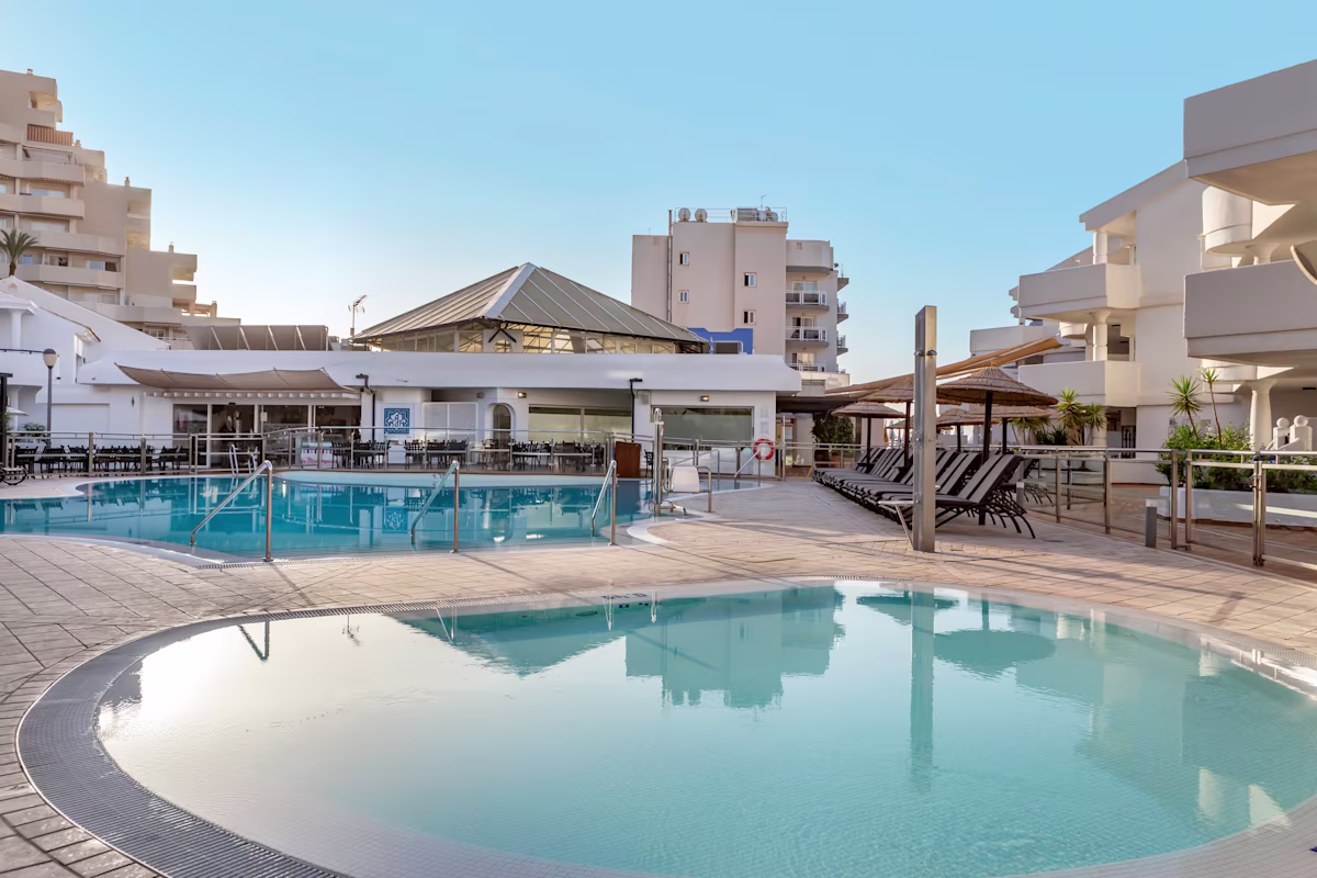 The resort features sparkling indoor and outdoor pools, a children’s wading area, a restaurant with open-air and inside dining, a spa for pampering treatments, and easy access to the Playa de Bil Bil.